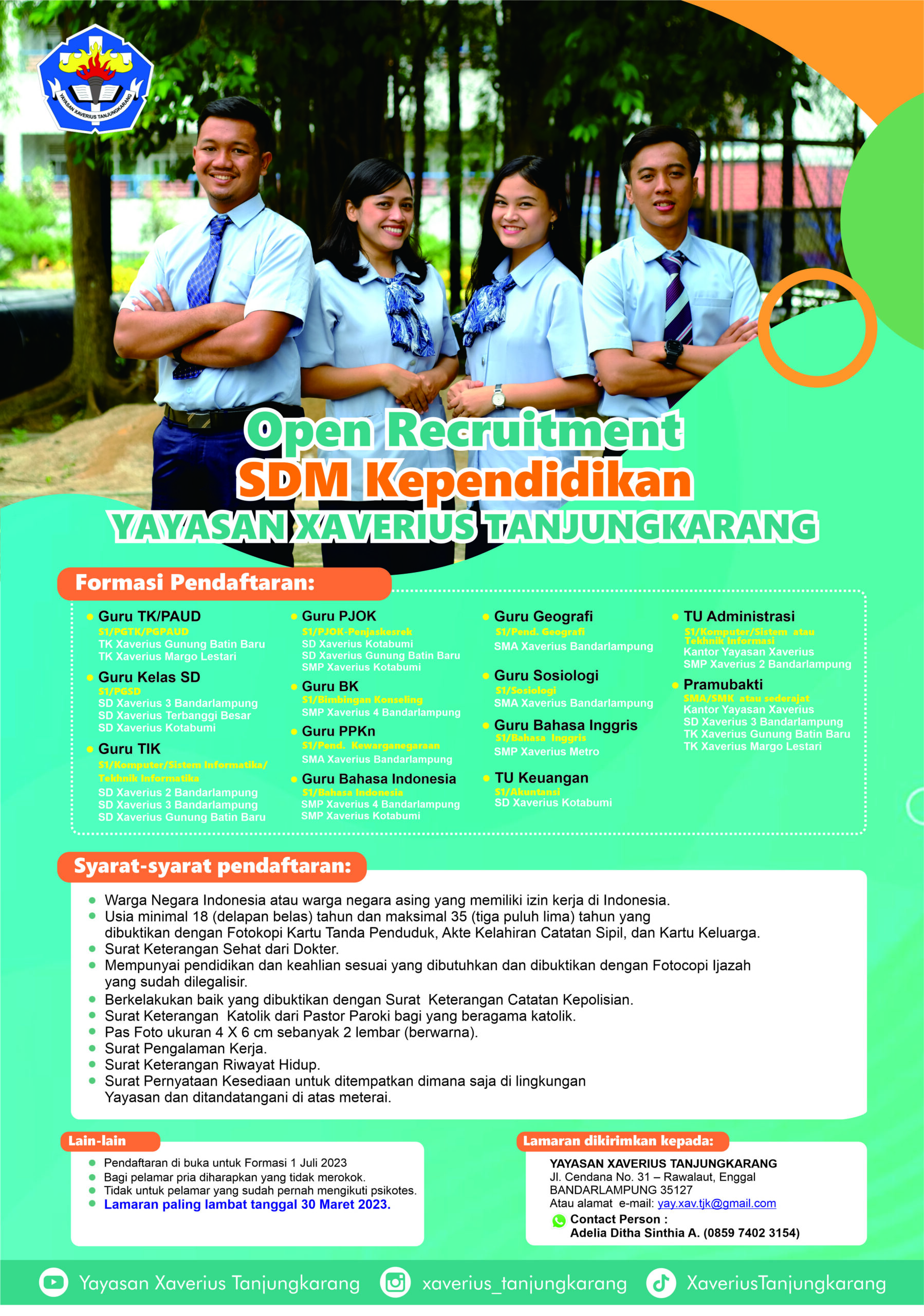 Ayo Gabung Bersama Kami Open Reqruitment SDM Kependidikan Yayasan Xaverius Tanjung Karang